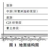 工程項(xiàng)目的地面結(jié)構(gòu)為砼基層、底涂、環(huán)氧砂漿和罩面,如圖1 所示。