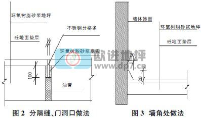 分隔縫按照砼墊層的分格縫設(shè)置,如圖2 所示,分隔縫用分格條,拉線固定,嚴(yán)格控制頂面標(biāo)高。地面與墻面交接處做45毅角。如圖3 所示。