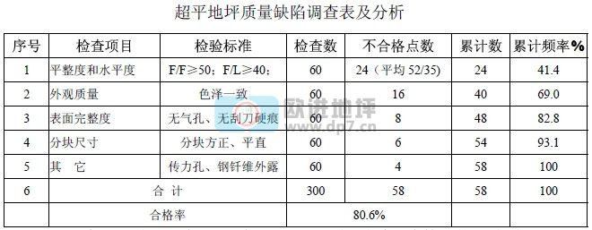 2009 年5 月,在地面墊層上選定工作環(huán)境相同、9 米*50 米的范圍、做法與正式地坪相同的區(qū)域進行試驗,對施工質量缺陷進行了全數(shù)檢查,并對檢查點進行了統(tǒng)計分析和數(shù)據(jù)整理,具體統(tǒng)計結果如下: