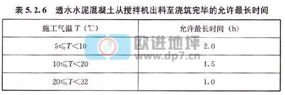 5.2.6透水水泥混凝土拌合物從攪拌機(jī)出料后,運(yùn)至施工地點(diǎn)進(jìn)行攤鋪、壓實(shí)直至澆筑完畢的允許最長(zhǎng)時(shí)間,可由實(shí)驗(yàn)室根據(jù)水泥初凝時(shí)間及施工氣溫確定.并應(yīng)符合表5.2.6的規(guī)定。